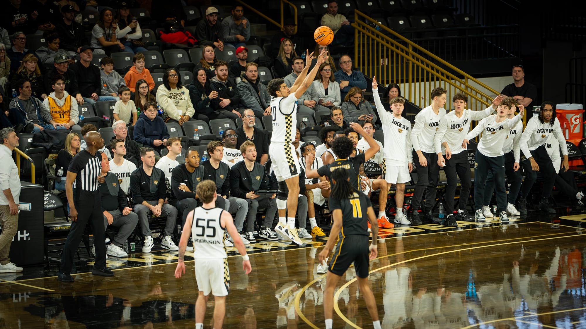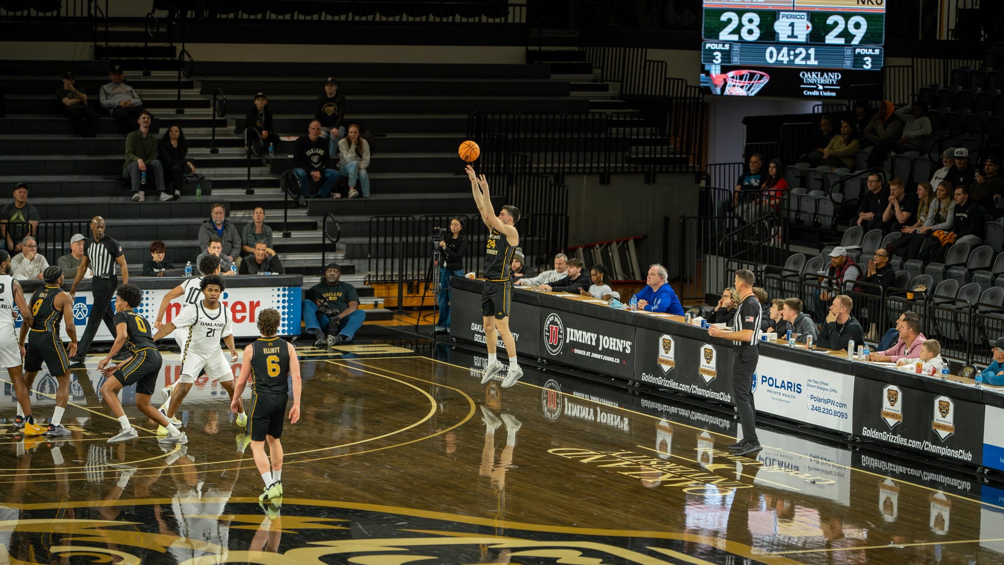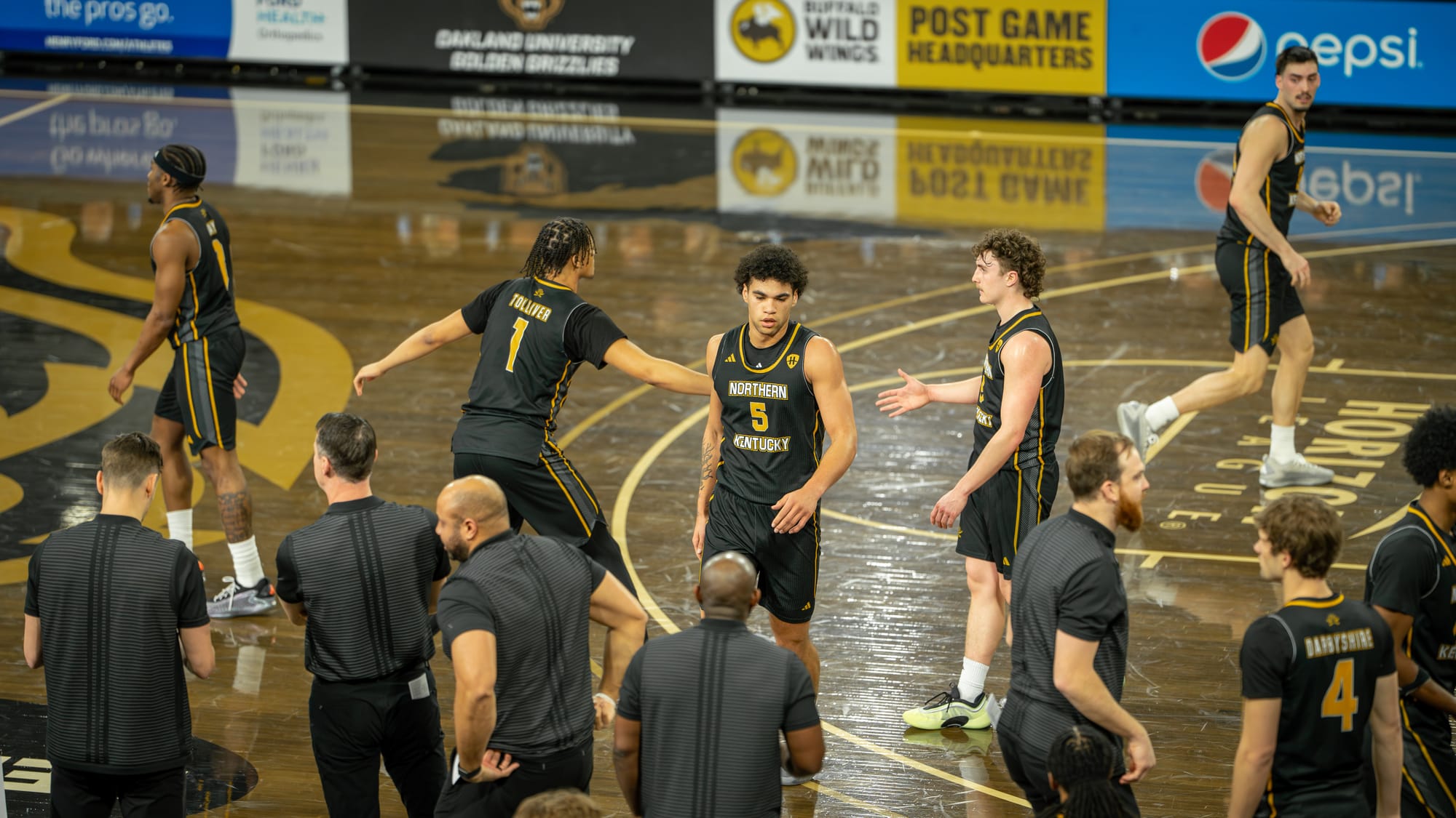 Once the game settled, the middle portion of the half became a trading-punches affair. Brody Robinson’s perimeter shooting kept Oakland within striking distance, while NKU found answers from multiple spots in the lineup.